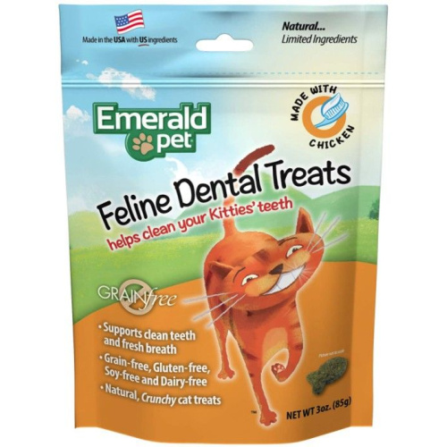 Emerald Pet Feline Dental Treats are the healthy grain-free dental solution your cat will love! These all-natural and nutritious crunchy treats are irresistible to cats. Discerning pet owners will love that theyre grain-free, gluten-free, soy-free, dairy-free, and made in the USA with US ingredients. Whimsical fish-shaped treats are big enough to encourage chewing versus just swallowing for maximum dental health. With innovative ingredients used to fight plaque and tartar, these delicious treats are rewarding for cats and their parents.
